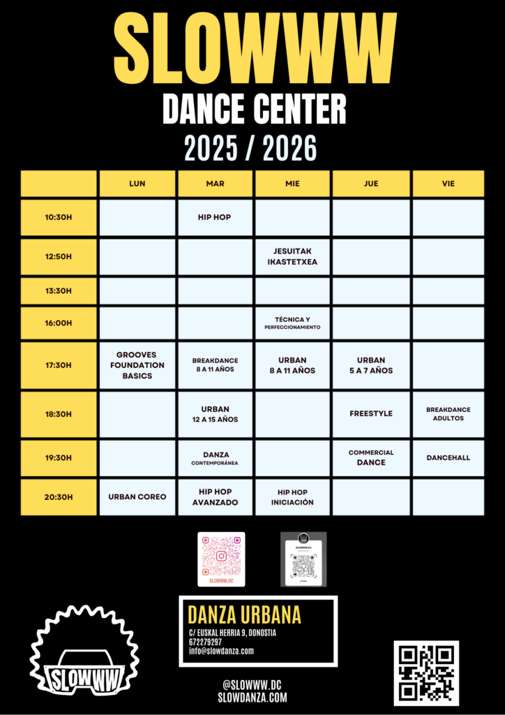 SLOWWW es una escuela de danza especializada en Danzas Urbanas, ubicada en el corazón de Donostia. Nuestra filosofía se centra en construir desde la base, de manera gradual, y en profundizar en los grooves, la base y la musicalidad. Nuestro objetivo es que, al bailar, puedas comprender una coreografía o un freestyle, y entender lo que está sucediendo tanto cuando observas como cuando ejecutas los movimientos, apreciando así los detalles que hacen que la danza sea tan especial.