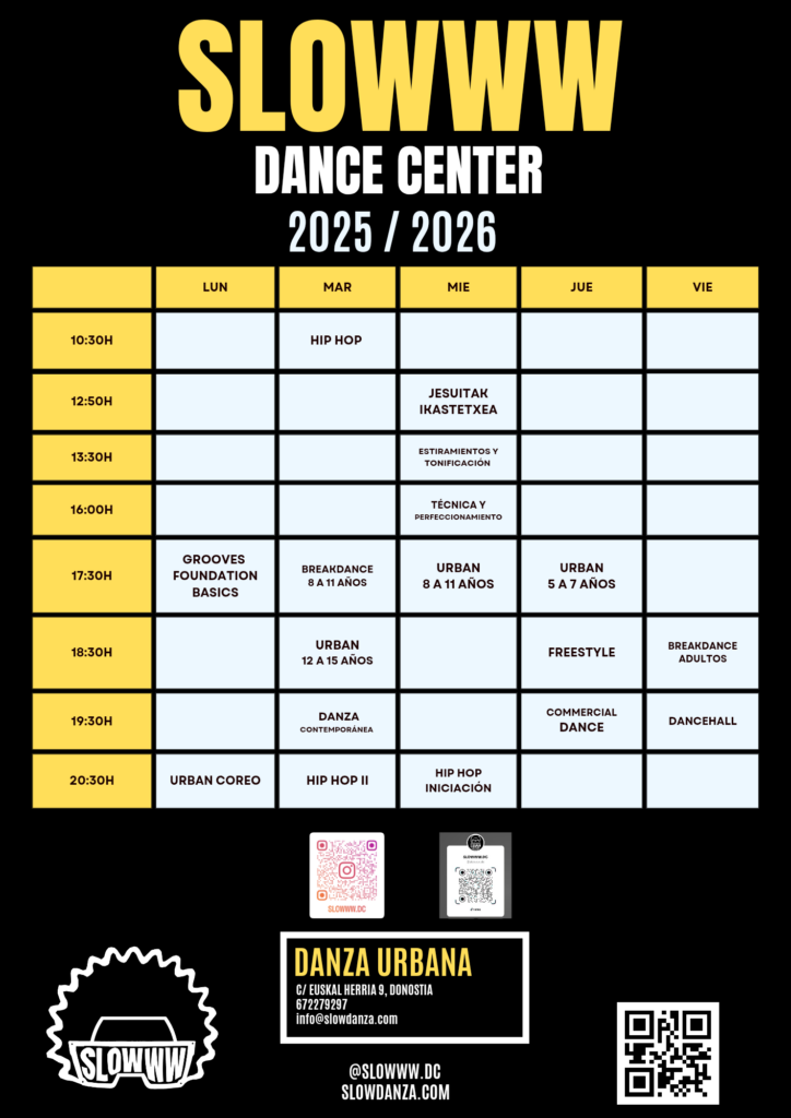 SLOWWW es una escuela de danza especializada en Danzas Urbanas, ubicada en el corazón de Donostia. Nuestra filosofía se centra en construir desde la base, de manera gradual, y en profundizar en los grooves, la base y la musicalidad. Nuestro objetivo es que, al bailar, puedas comprender una coreografía o un freestyle, y entender lo que está sucediendo tanto cuando observas como cuando ejecutas los movimientos, apreciando así los detalles que hacen que la danza sea tan especial.