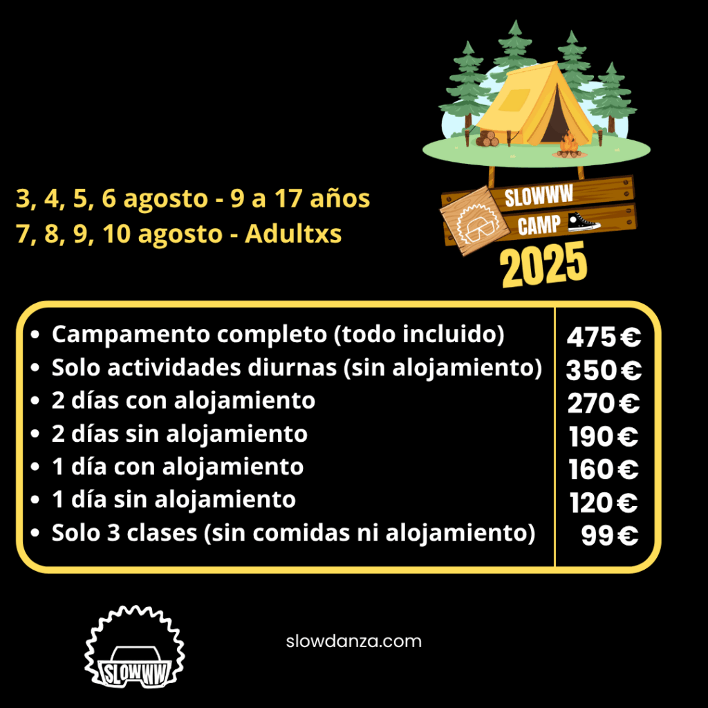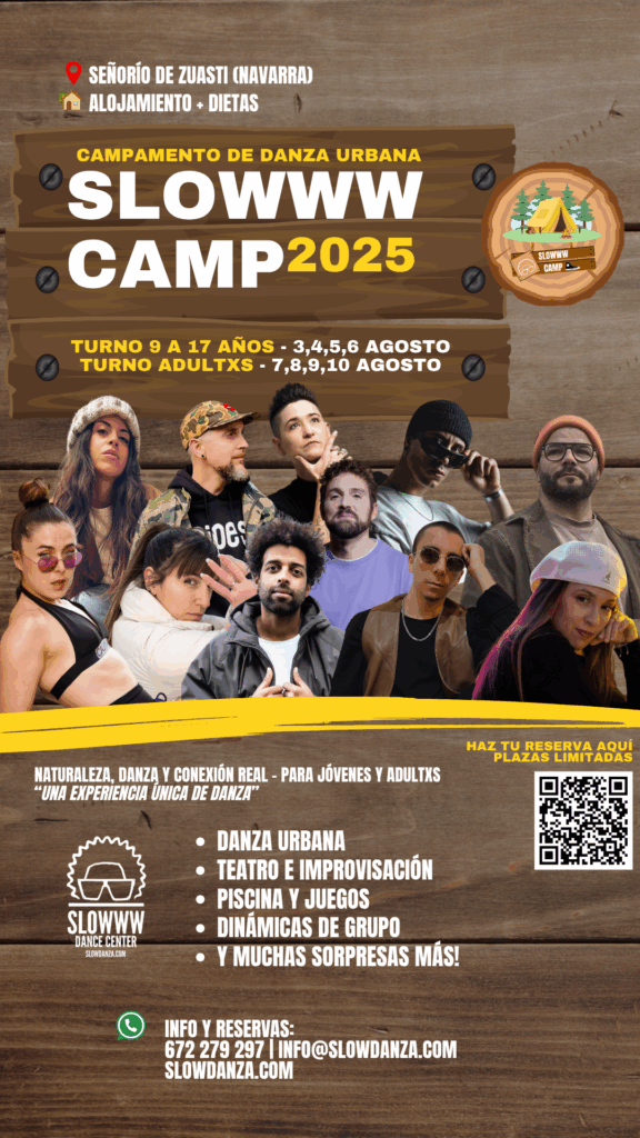 Este verano, Slowww Dance Center te invita a vivir el campamento más emocionante del año. Nos alojaremos en los bungalows del señorío de Zuasti (Navarra) en un entorno natural donde aprenderás y conectarás con otrxs compañerxs y disfrutarás de actividades diseñadas especialmente para ti a través de la danza urbana y un montón de sorpresas.